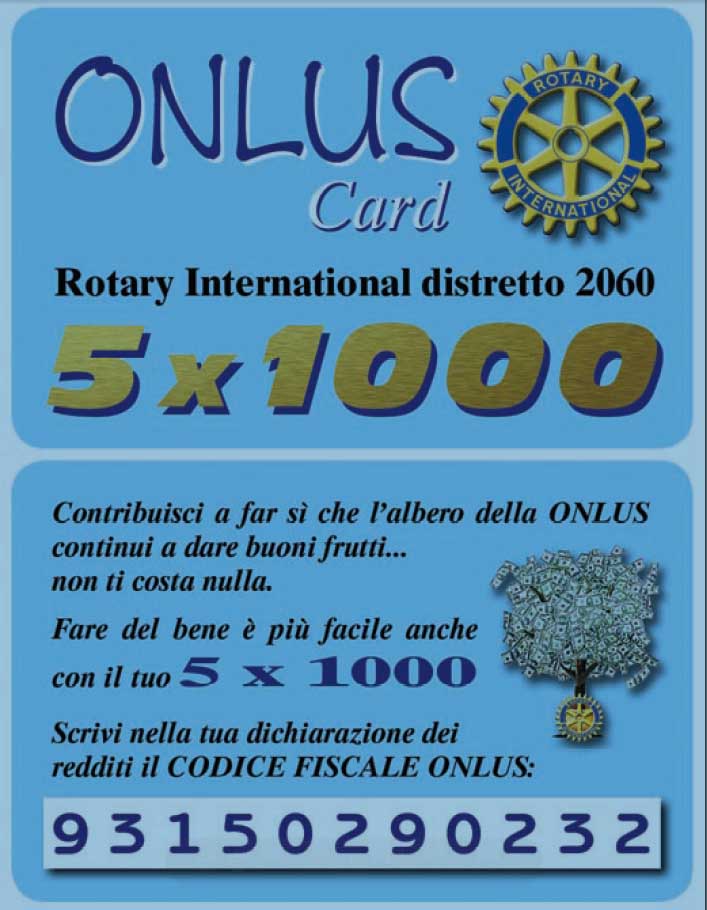 Per consentire ai Club di perseguire con maggiore efficacia le finalità sociali contemplate nello Statuto è stata creata l’Organizzazione Non Lucrativa di Utilità Sociale Progetto Rotary–Distretto 2060 Onlus, chiamata in breve Rotary Onlus.