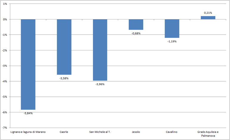 L’andamento delle presenze turistiche evidenzia nel confronto 2013 su 2012 indica purtroppo in Lignano -5.84 % il peggior risultato nel balneare dell’Alto Adriatico (Vedasi il grafico di confronto con Caorle (-3,58%), San Michele al Tagliamento (-3,96), Jesolo (-0,68), Cavallino (-1,19) e Grado (+0,21)