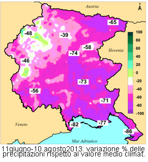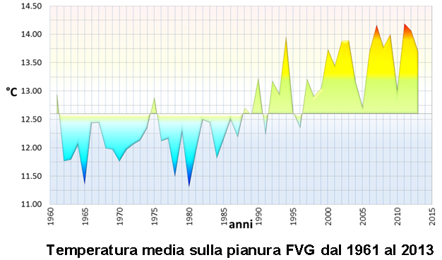 Nella nostra regione, fra i primi dell’800 e i primi anni 2000, la temperatura media annua a Udine è aumentata complessivamente di 0,5 - 1,0 °C. Questa tendenza viene rafforzata dall’analisi delle temperature medie delle stazioni di Gorizia, Talmassons, Fossalon e Trieste nautico (dati dell’Ufficio Idrografico) per il periodo 1961- 2009, confrontate con le serie di 47 stazioni regionali (dati Regione FVG – Osmer) per il periodo 1991-2013 (Fig. 3). Il metodo di analisi dei dati utilizzato indicherebbe un riscaldamento di circa 1°C/50 anni, più alto rispetto a quello globale (0.8°C/100 anni); dal 2000 in poi sono scomparsi valori di temperatura media annua inferiori ai 13°C e comparsi dati superiori ai 14°C. L’aumento della temperatura si è manifestato in misura diversa nelle varie stagioni e nelle varie zone climatiche del nostro territorio; è tuttavia possibile delineare quali tendenze comuni un forte riscaldamento primaverile ed estivo (evidente anche nel numero di giorni con temperatura massima superiore a 30°C, in molte zone cresciuto da circa 35 giorni a circa 50 dopo il 2000), mentre in inverno solo alcune località si riscaldano (anche se ma non si può ignorare che i due inverni più caldi sono entrambi posteriori al 2000); in generale, invece, l’autunno manifesta una certa stabilità.