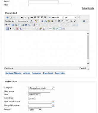 Finalmente abbiamo un form che trasforma automaticamente questo testo in maiuscole, pubblica gli articoli nelle categorie (ovvero nelle pagine) selezionabili sopra: News, Notizie o Bacheca del Volontario.
