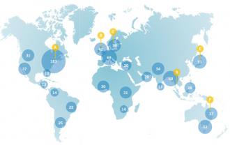 La mappa mostra il numero di borsisti del Rotary ( ) e dei centri della pace del Rotary nel mondo ( ). Per la mappa interattiva www.rotarianactiongroupforpeace.org