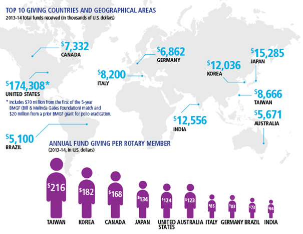 Secondo il Chronicle of Philanthropy, la Fondazione Rotary ha ricevuto 239.576.000 dollari nel 2013, un aumento del 32,4 per cento rispetto all'anno precedente