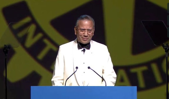 Il Presidente eletto KR "Ravi" Ravindran annuncia il suo tema presidenziale “Siate un regalo per il mondo”.