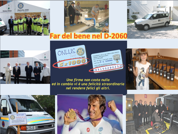 Il Presidente ha ricordato il messaggio che il Distretto ha inviato a tutti i soci per ricordare loro di sostenerte la Onlus Distrettuale. La Rotary Onlus è finanziata in via prioritaria, come tutte le altre Onlus, tramite il 5 per mille della personale dichiarazione dei redditi che i singoli soci, loro consorti, amici e simpatizzanti decidono di devolvere alla stessa, inserendo il Codice fiscale 93150290232.